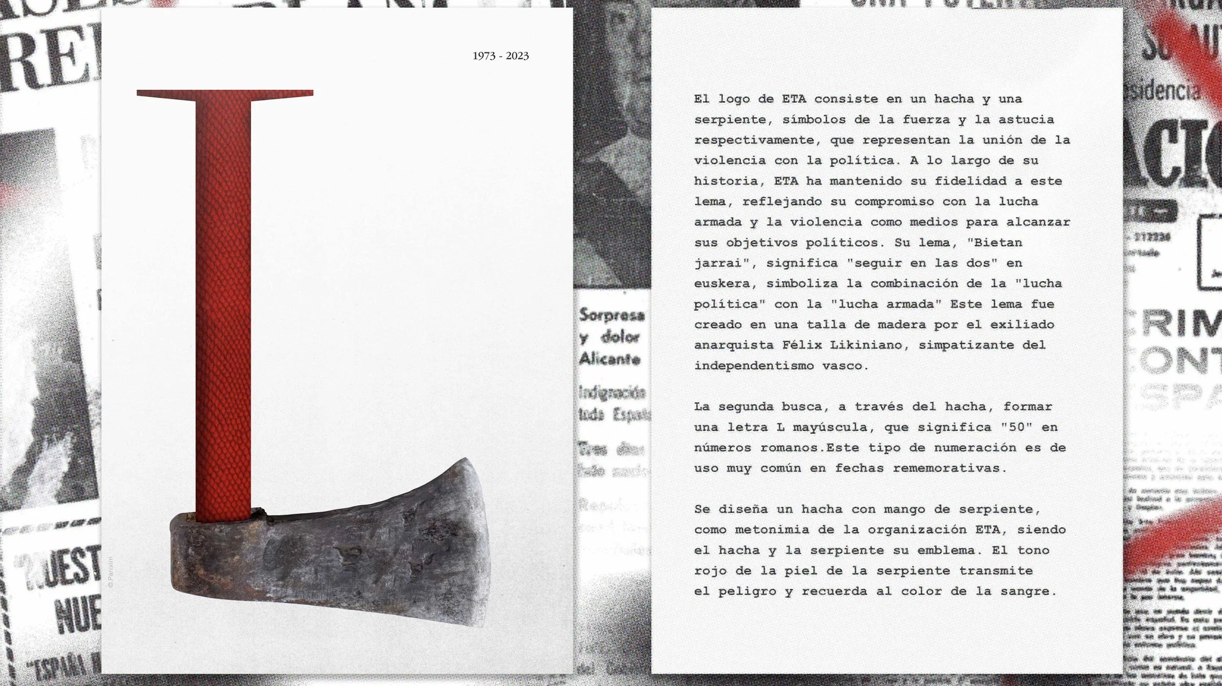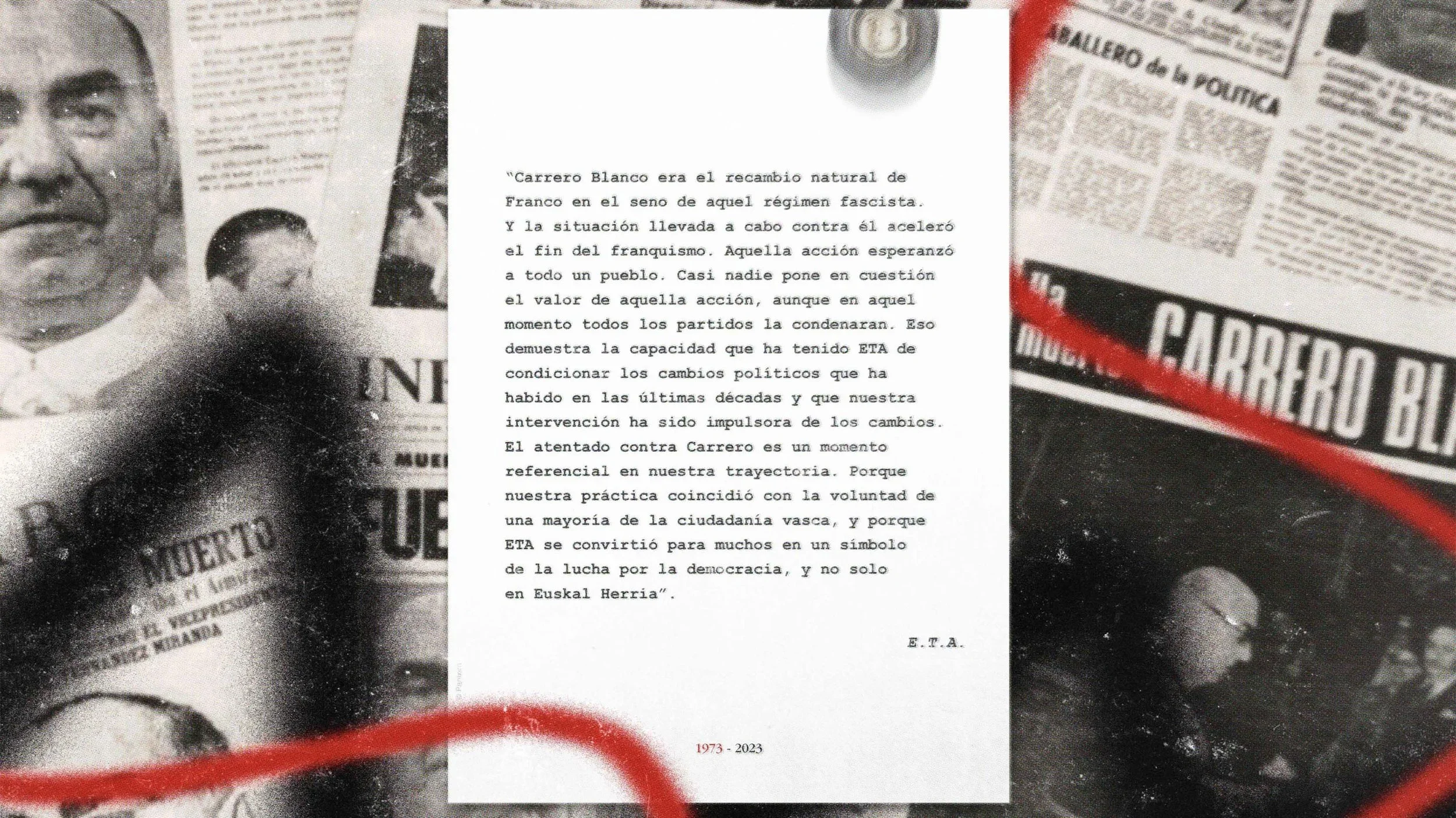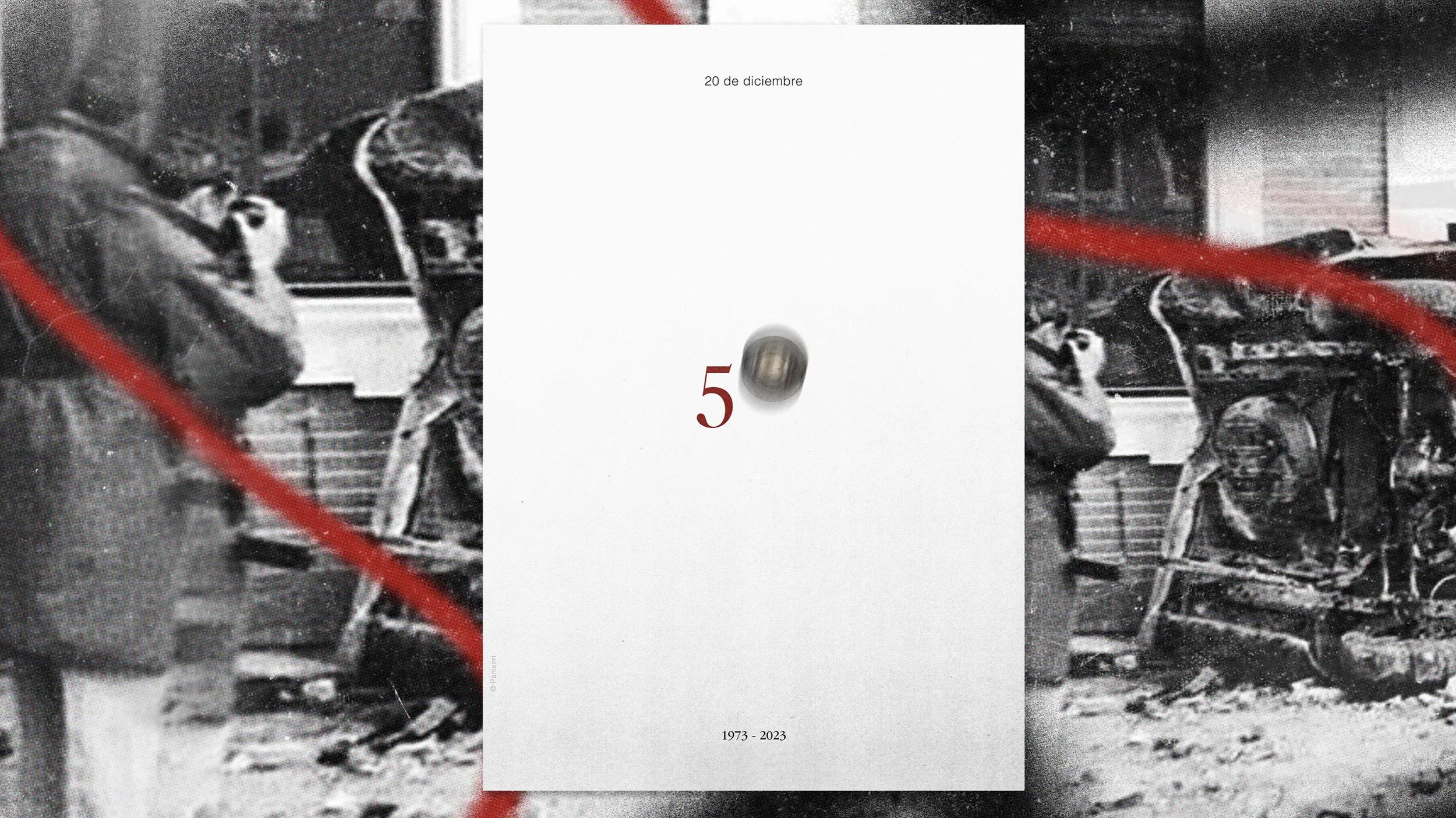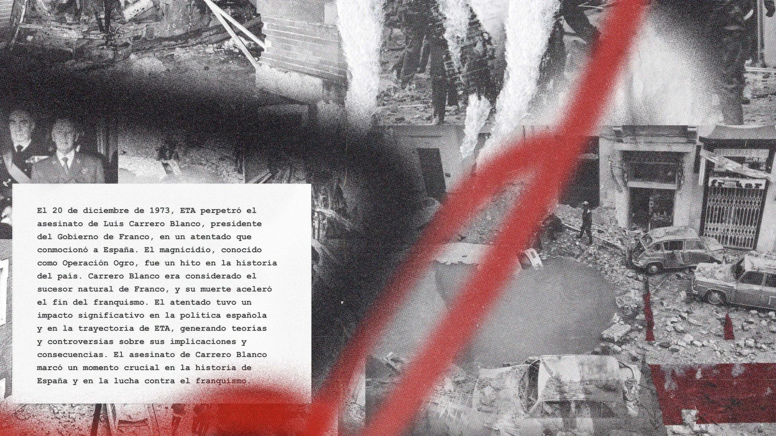 A finales del 2023 se conmemoró el 50 aniversario del magnicidio de Carrero Blanco por parte de E.T.A. Este cartel y sus variantes acompañan visualmente el relato de lo sucedido. El diseño busca conmemorar este hito histórico y generar conciencia sobre su significado en la historia de España. El pesado coche volando por los aires fue algo que se recuerda en el imaginario popular. El artículo aborda el impacto del asesinato en el final del franquismo, así como las teorías y controversias que han surgido en torno al magnicidio a lo largo de los años.