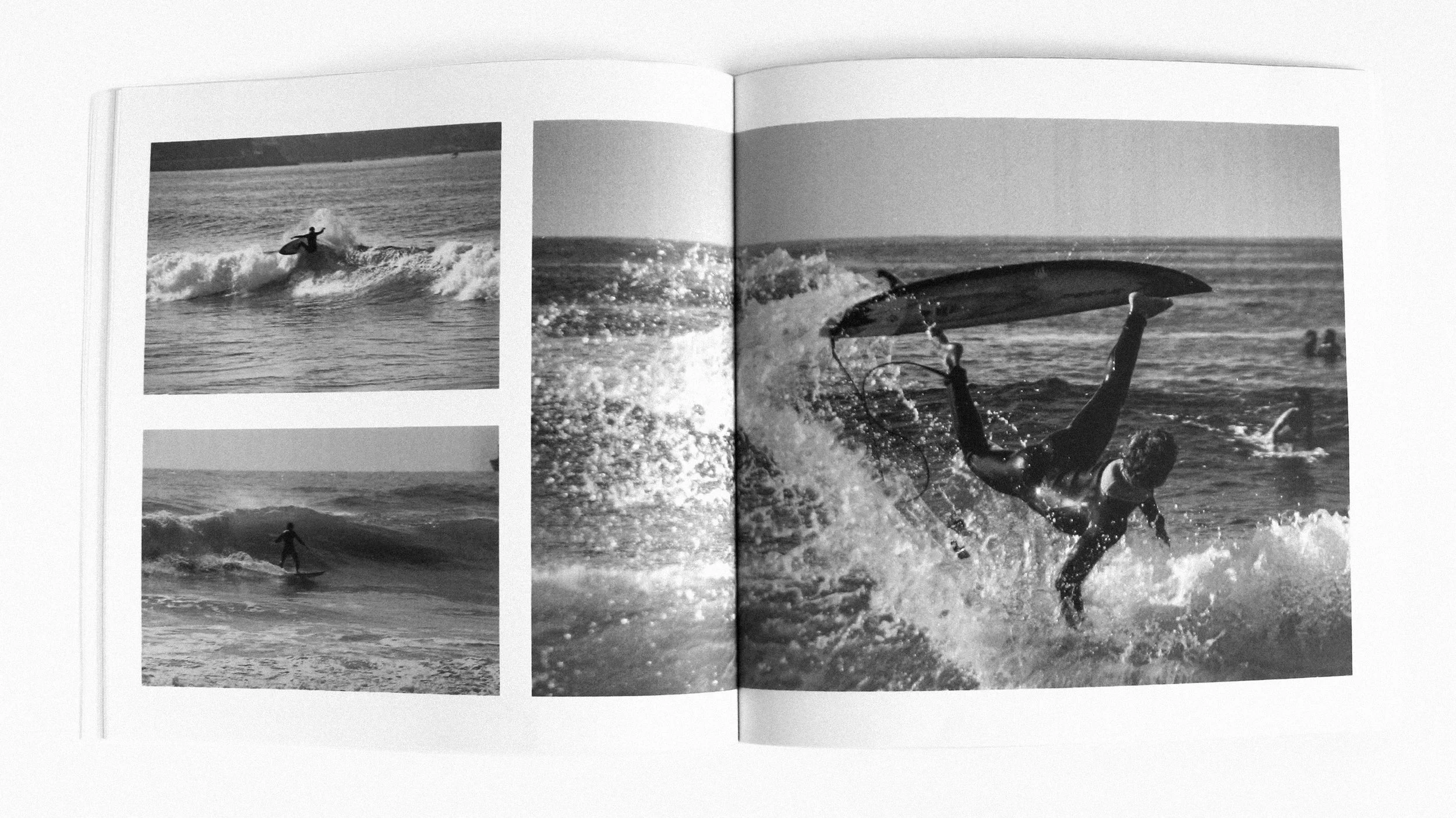 Un libro que narra visualmente la vida alrededor del surf y del mar. La sobrecubierta envolvente está troquelada de tal modo que para poder acceder al libro, se abre “rompiéndola”, como una ola de mar. Este troquelado genera que la tira de papel se ondule como una ola antes de romper.
